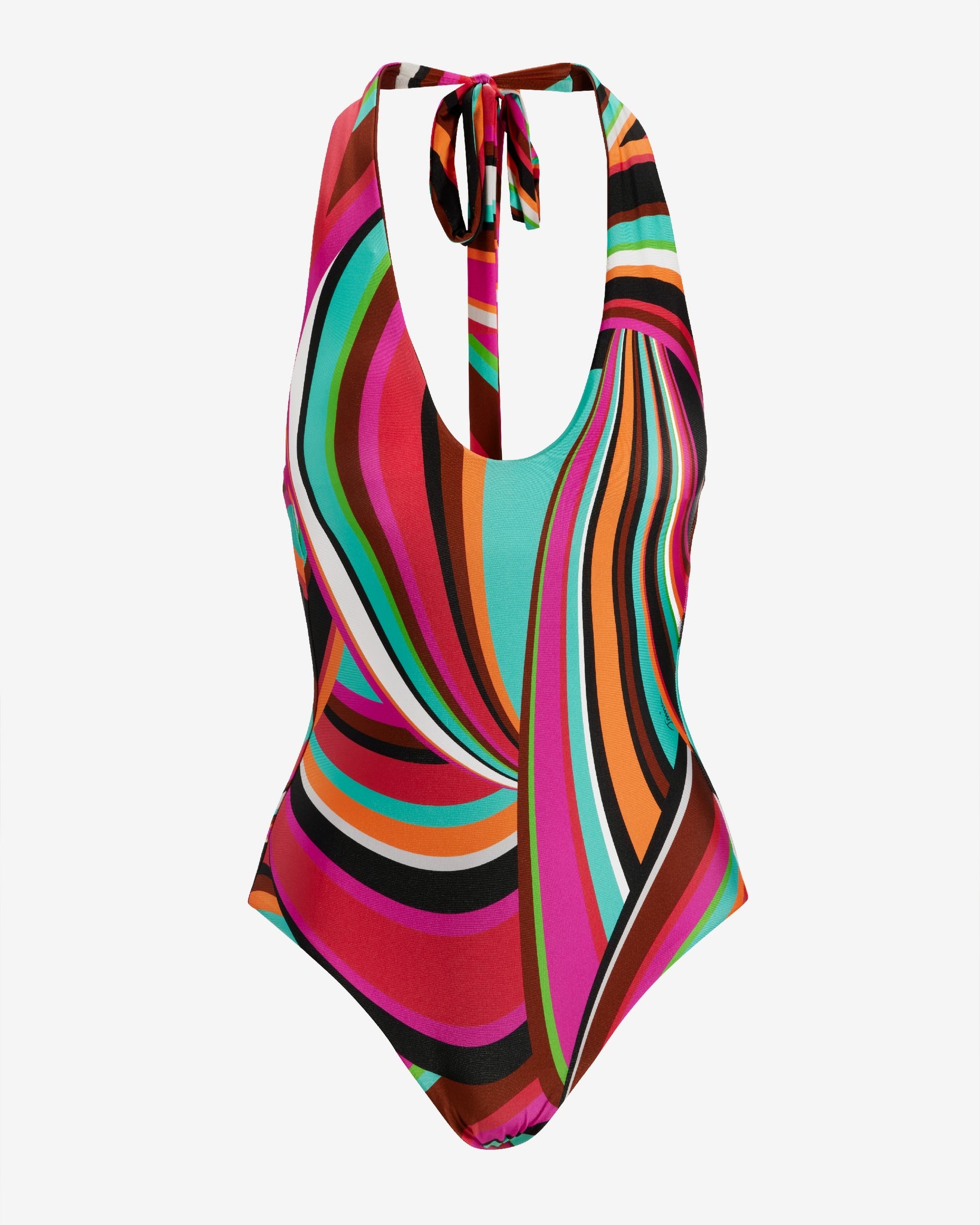 A striking, reversible one-piece designed for bold beach moments. The Abstract Halter One Piece features a plunging V-neck, adjustable halter straps, and a sleek shelf bra. Wear it printed or solid—two standout looks in one, with just the right amount of coverage.