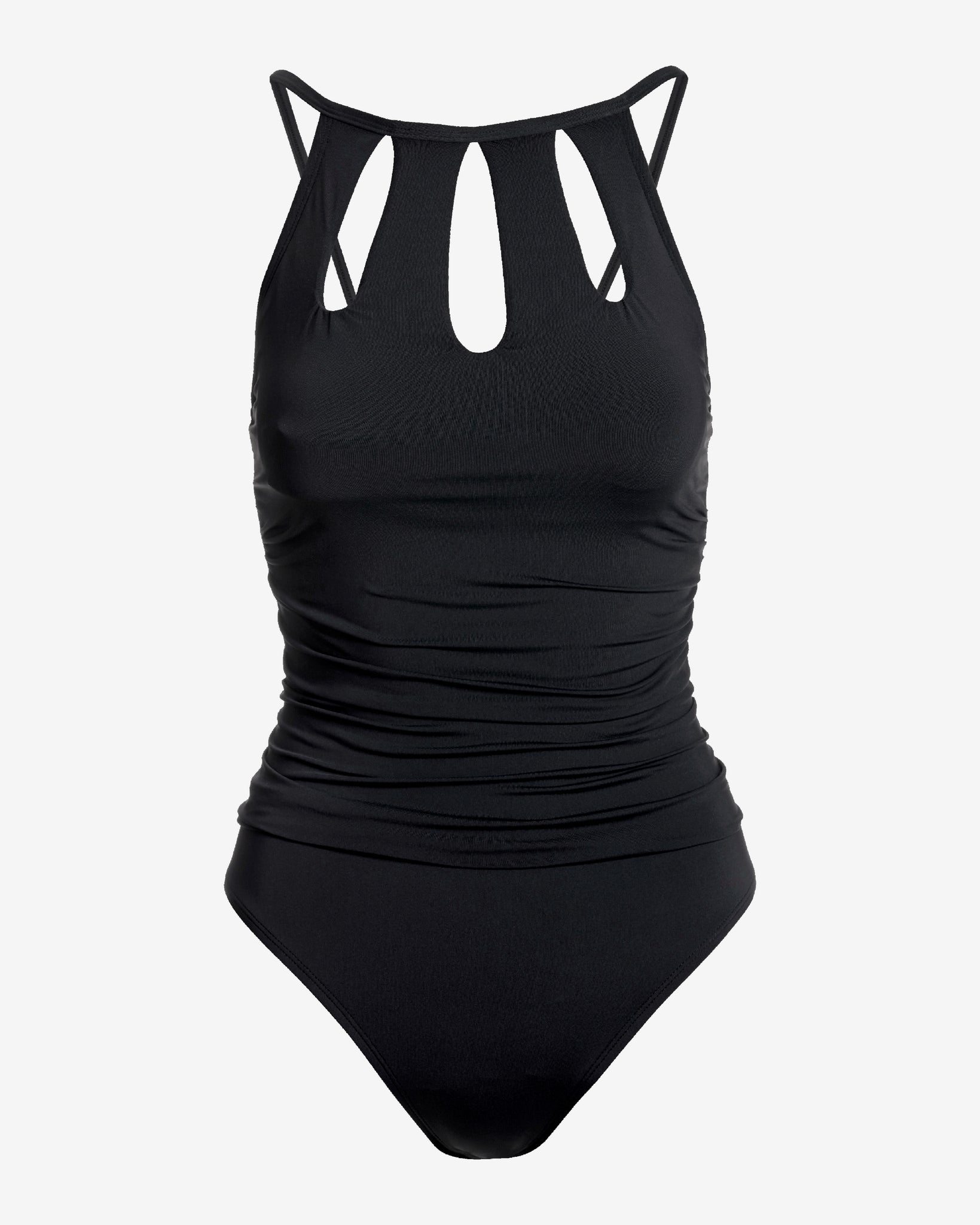 This one-piece swimsuit offers an elegant update on a classic swim look, complete with a high neck and cut-out details. Supportive, comfortable design details include moderate bottom coverage, removable cups, and adjustable shoulder straps. This ‘little black swimsuit’ is a timeless staple for your swim wardrobe.